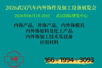 2026武汉国际汽车内外饰件及加工设备展览会 时间:2026年6月18-20日 地点:武汉国际博览中 定展联系—组166委1994会3093